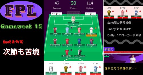 ▼Gameweek14はこちら irohasesun-fm-foot.hatenablog.com ようやくまともな水準の点数を獲得し、さあここから反撃といきたいところでしたが15節は様々な要因で選手が相次ぐ離脱をしてしまい、更にアタッカーもエバートンのグレイを除きゴール関与が無かった…