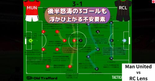 アメリカツアーを終えオールド・トラッフォードに帰還したマンチェスター・ユナイテッドはRCランスと対戦。 後半立て続けの3ゴールは喜ばしいが、選手個々の裁量に任せすぎるビルドアップや全体的なオフボールの動きの少なさは相も変わらず不安材料。