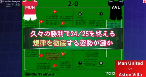 ようやく、最後の最後にプレミアリーグでの勝利を勝ち取って24/25シーズンの全日程を消化したユナイテッド。 先制弾のファーポストへのインスイングクロス→DF裏を取ったアタッカーのダイレクトショットという形をどれだけ安定して出力できるかが得点増加への…