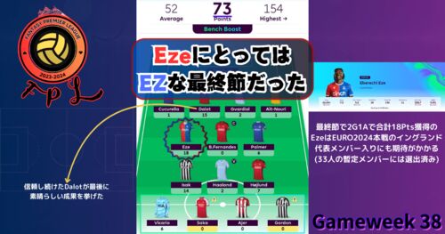 アーセナル、リバプールが破れ首位争いに動きが見られたGW33だが、話題を掻っ攫ったのは1試合4ゴールで一気に得点ランキング1位に躍り出たコール・パルマー。 彼の恩恵にあずかって私自身も今季初となるチームスコア3桁到達!!