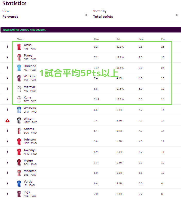 まず1についてですが、FWにおけるアベレージとはそのまま得点貢献の安定感と言い換える事が可能で、ここ数年のFPLではSalah,Kane,Vardyの3選手が特に人気を集めていました。基本的にはシュートチャンスの多い強豪クラブのレギュラーが試行回数の面で有利になりやすいですが、ご覧のように今シーズンの序盤は荒れに荒れているので過去の人気選手をそのまま選んでいるだけでは上位に進出できません。