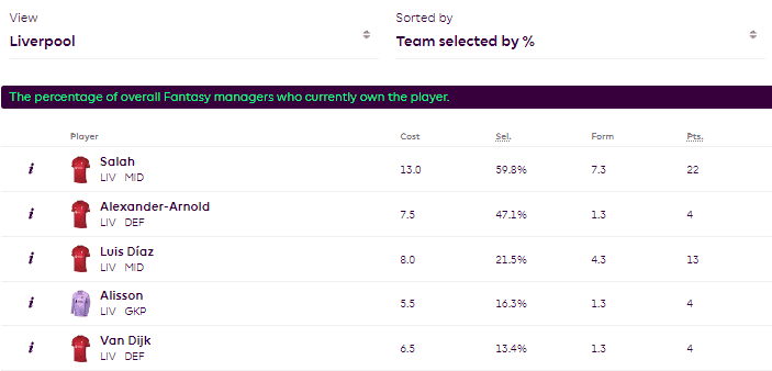2節終了時の順位表ではユナイテッドが最下位だったという事もあってクローズアップされていなかったものの、実はリバプールもまだリーグ戦の勝利がありません。過去シーズン、3節までの戦績は13勝2分けと絶大な強さを誇っていたので、今季もFPLプレイヤーは"序盤のリバプール"というブランドに信頼を寄せていたのだろうという事は選出率からも推測する事が出来ますが、その期待に応えているのは現状サラー1人。
